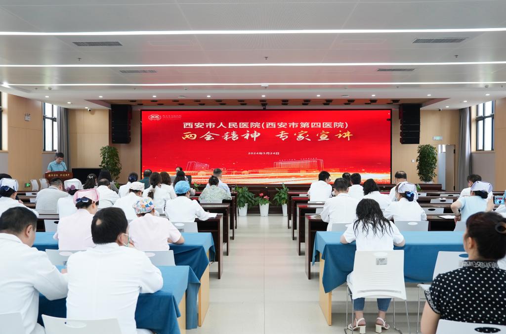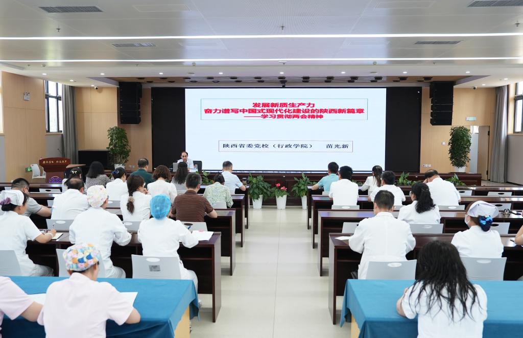 为深入学习贯彻2024年全国两会精神,进一步统一思想、凝聚共识,5月24日下午,西安市人民医院(西安市第四医院)邀请陕西省委党校(行政学院)党史教研部主任、省委讲师团特聘专家苗光新教授作《发展新质生产力奋力谱写中国式现代化建设的陕西新篇章》专题宣讲,院领导及全院中层干部、各支部书记及党员代表共计二百余人参加会议。苗教授从不同角度、不同层面深入解读发展新质生产力、推动高质量发展的内涵与意义,引导大家更加准确地把握国家政策导向。