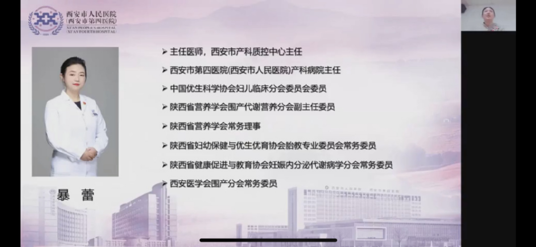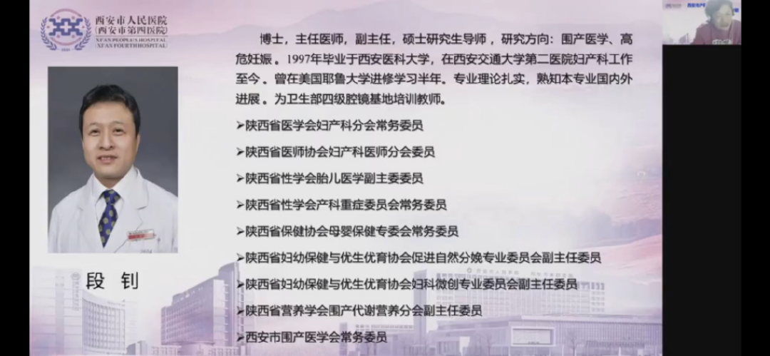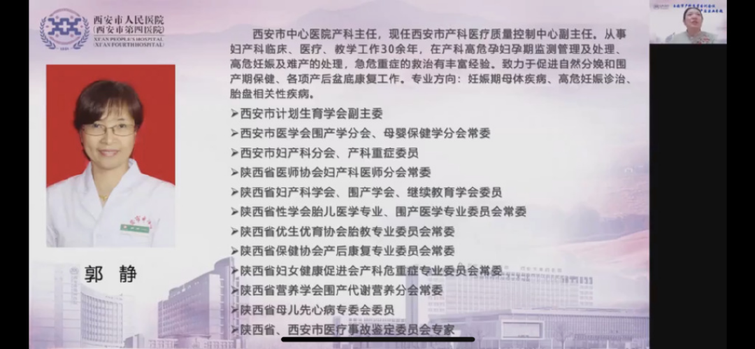 会议还邀请了西安市产科质控中心副主任、西安市中心医院产科主任郭静、西安市第三医院妇产科主任范小斌、西电集团医院产科主任贾小文对大会进行授课主持。各位专家的线上授课内容精彩纷呈、内容详尽、讲解细致,让参会学员受益匪浅。