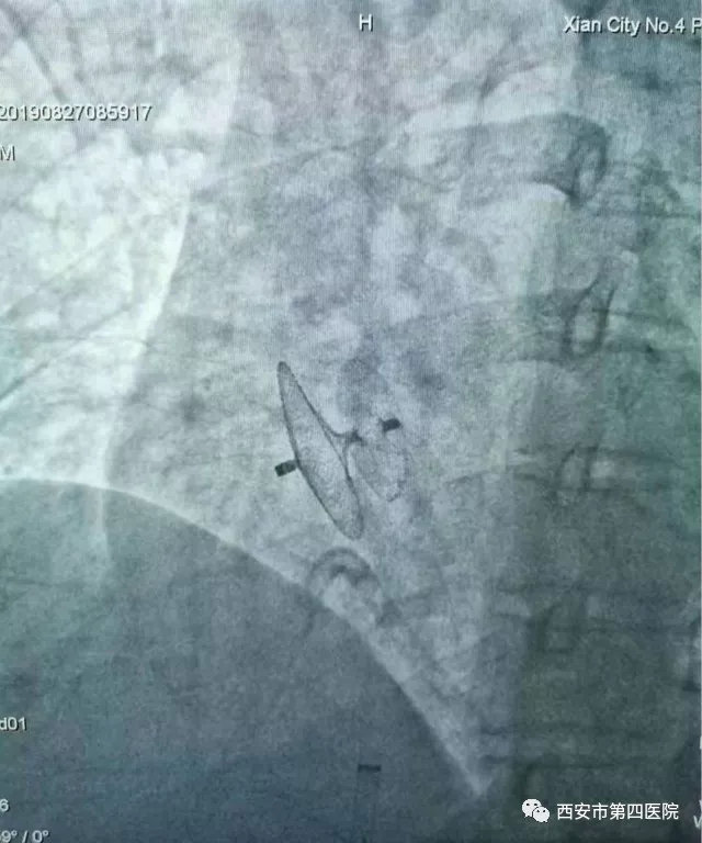 具体手术方式为:患者取平卧位,常规消毒,利多卡因局麻,成功穿刺右侧股静脉后置入鞘管,在超滑导丝引导下经未闭卵圆孔送5F右心导管至左上肺静脉,然后交换加硬导丝至左上肺静脉,沿加硬导丝送输送鞘至左心房,经输送鞘送卵圆孔未闭封堵器PF2535至卵圆孔处,超声下观察封堵期位置合适、无分流,正侧位观察封堵器位置合适,遂释放封堵器,正侧位x线下,超声下提示封堵成功,拔出鞘管,安返病房。