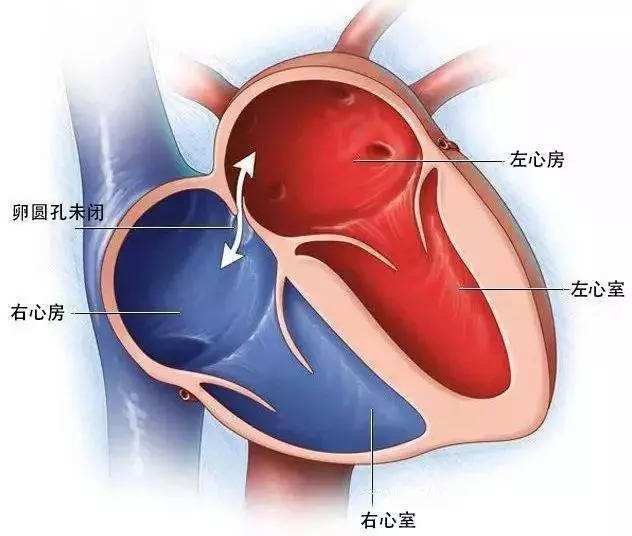 卵圆孔(Paten Foramen Ovale)一般在出生第1年内会自动闭合,因此新生儿和婴儿的卵圆孔是未闭合的,如果超过3岁卵圆孔仍未闭合称为卵圆孔未闭(PFO),病理上该孔是出生后原发隔与继发隔未能自然粘连融合,在两者间残存的裂隙样通道,早期左心房压力大于右心房,出现从左向右分流,当右心房压力增高大于左心房时即出现从右向左分流。