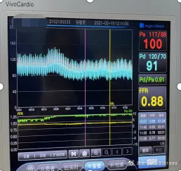 造影提示双支血管病变,病变程度虽然看起来不是“命悬一线”,但似乎也有较为明显的狭窄,仅凭造影不能确定下一步策略。经过大家的讨论,冠心病中心决定采用现在国际推荐的冠状动脉血流储备分数(fractional flow reserve,FFR)来进行决策。