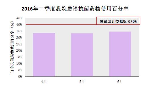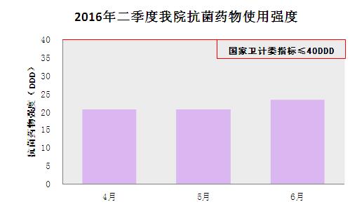2016年第二季度,我院门诊和急诊抗菌药物使用率、住院抗菌药物使用率和使用强度均低于国家卫计委指标要求,且每月数据波动不大,指标总体控制平稳。