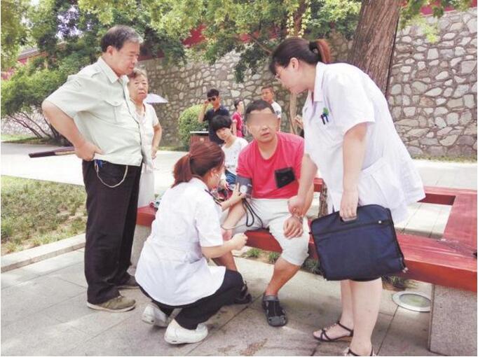 11时27分,大雁塔西步行街的隔离墩挡住了救护车飞奔的车轮,急救人员跳下救护车奔向病人。记者看到汗水已经打湿了胡萍与她的同事的后背,汗水像珠子一样从他们的脸颊上滚落下来。急救人员远远看见坐在树下的病人,顾不得擦去脸上的汗水,胡萍与护士刘丹急忙跑上前拿出血压仪测量血压,担架工人老李、老刘赶忙推来了急救担架。