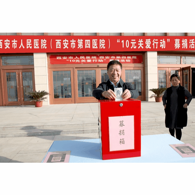 同时,在西安市第四医院 西安市人民医院募捐活动也在有序进行,除在门诊一部楼前设立了募捐箱外,社工部还招募了8名院内志愿者,手持捐款活动倡议书,来到门诊诊室、住院病区,让因工作不能到活动现场的职工也能献出一份爱心。