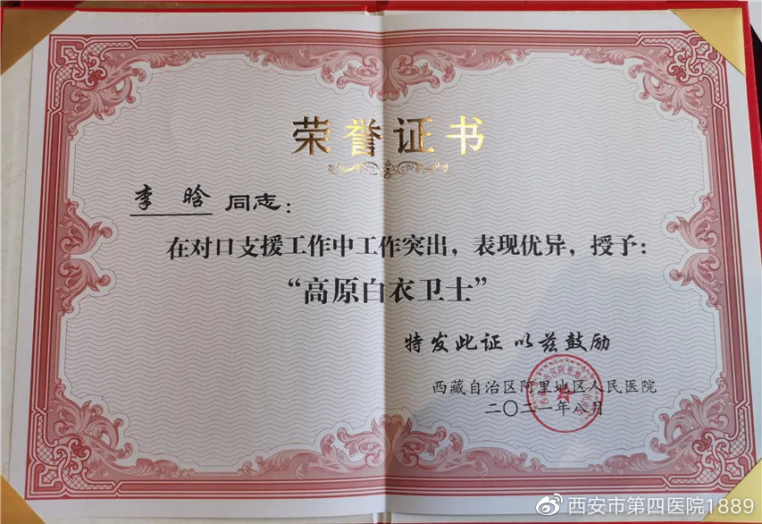他们也荣获了中共阿里地区委员会和行政公署“优秀组团式援藏医疗人才”荣誉称号;荣获阿里地区人民医院“援藏先进工作者”、“高原白衣卫士”等荣誉称号。