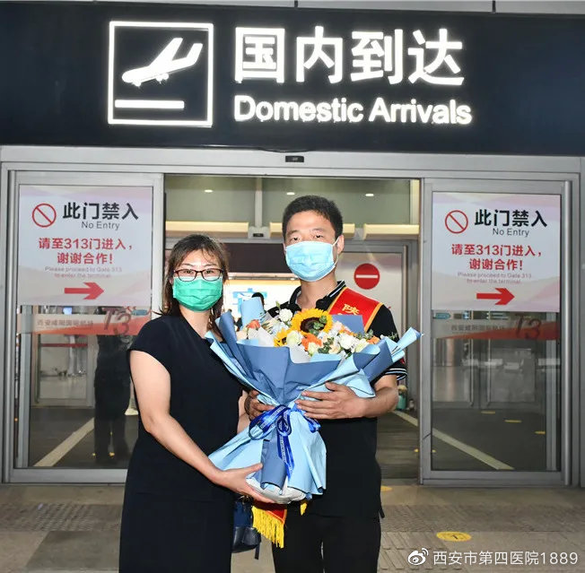迎接人员按照新冠疫情防控要求,佩戴口罩,高举欢迎从雪域高原载誉归来的白衣卫士横幅,翘首从藏区返陕的航班降落在咸阳国际机场。