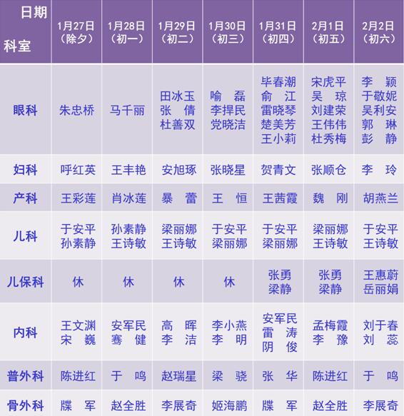 以下是部分科室春节期间值班安排,遇特殊情况,以当天安排为准,请根据本人情况选择医师就诊。1月27日(除夕)--2月2日(初六)生殖科不开诊, 1月27日(除夕)至1月30日(初三)儿保科不开诊,其余科室门诊正常服务,儿科、急诊科24小时接诊。