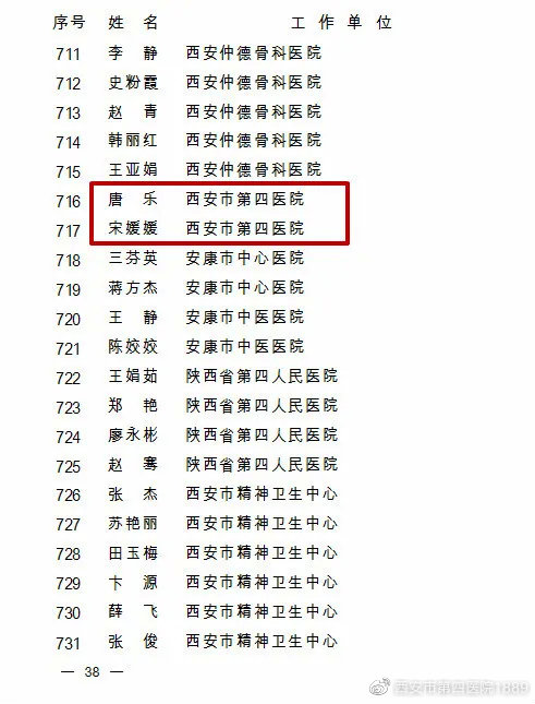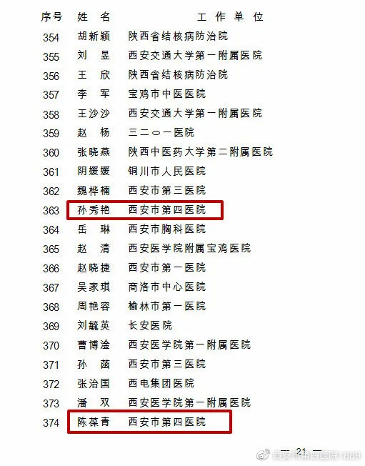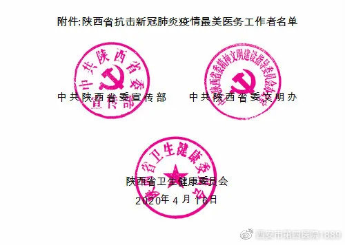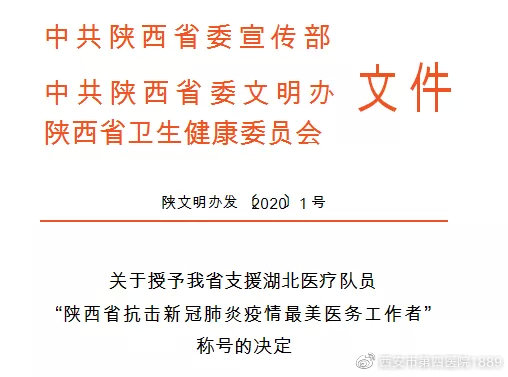 为了大力弘扬新风正气,培育和践行社会主义核心价值观,深化“厚德陕西”建设,促进新时代公民道德建设,陕西省委宣传部、陕西省委文明办、陕西省卫生健康委决定授予我省支援湖北医疗队1204位同志 “陕西省抗击新冠肺炎疫情最美医务工作者”荣誉称号。西安市第四医院陈葆青、杨波、赵立群、孙秀艳、姬萍、马茹、崔林娜、李少武、唐乐、宋媛媛,共10名医护人员获此殊荣。