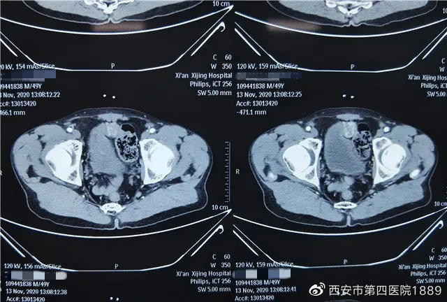 一次偶然的机会,张先生来西安进行检查,外院膀胱镜检查未见异常,超声检查报告结果:膀胱前方实性结节、血运丰富,无法确诊,建议活检。后几经辗转,于11月20日,来到了西安市人民医院(西安市第四医院)航天城院区泌尿肾脏病院就诊。泌尿肾脏病院的薛庆副主任医师仔细询问病史,并详细对患者进行了查体后,综合考虑为肿瘤。住院后进行CT检查,结果显示为膀胱前壁占位约2cm大小,考虑恶性肿瘤,需行手术治疗。