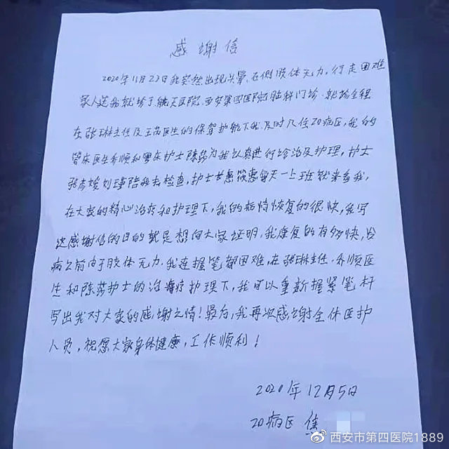 一封质朴的感谢信不仅仅是道出了患者的心声,也表达了对医护人员的感激之情,更是对西安市人民医院(西安市第四医院)医德医风的认同,对医务人员精湛的技术、热情服务的褒奖。脑科病院将继续砥砺前行,发展科室的专科优势,打造专科品牌,为广大患者共谋健康福祉。也将继续发扬大医精诚的精神,用所学、用真心、用仁心去挽救每一位患者、帮助每一个生命!